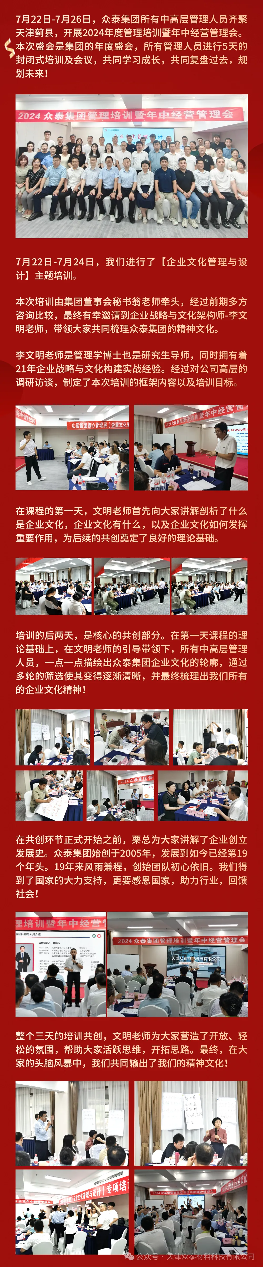 7月22日-7月26日,眾泰集團(tuán)所有中高層管理人員齊聚天津薊縣,開展2024年度管理培訓(xùn)暨年中經(jīng)營管理會(huì)。本次盛會(huì)是集團(tuán)的年度盛會(huì),所有管理人員進(jìn)行5天的封閉式培訓(xùn)及會(huì)議,共同學(xué)習(xí)成長,共同復(fù)盤過去,規(guī)劃未來!